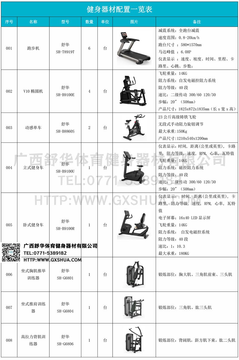 1.多宝电竞V9跑步机SH-T8919T*6台-V9+采用全跑台减震设计,为跑者提供舒适的落脚地感和稳定的跑步支撑,良好的缓冲防护,降低膝关节受伤风险。商用大跑台,为跑者提供从容奔跑空间,180kg承载力,580*1570纯跑台面积,满足专业健身需求。V9+采用F级商用马达,6HP峰值马力,20km/h最高速度,提供源源不断的动力。V9+内置健身直播软件,每周提供直播课程,内含大量专业线上健身点播课程,可为健身房不同人群提供多样化健身课程服务。